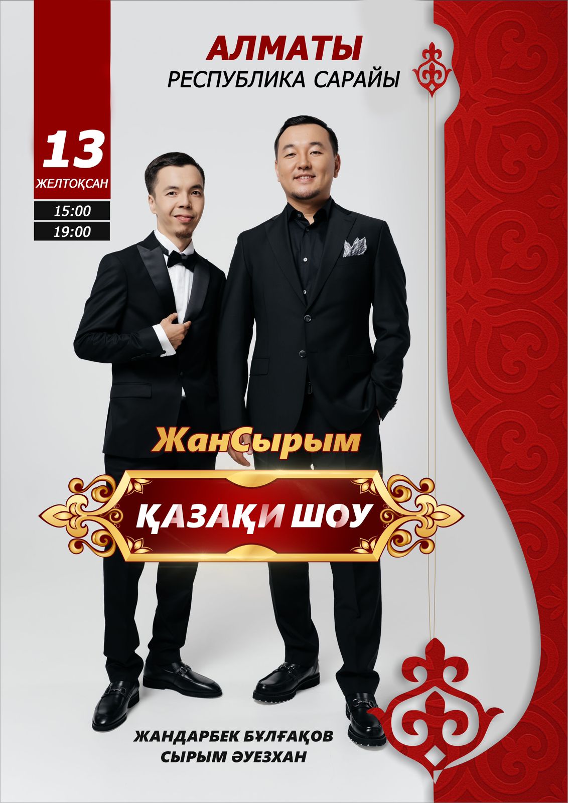 Қазақ халқының рухани өміріндегі аса құнды жәдігер, ұлттық мәдениеттің алтын арқауы айтыс өнерін кеңінен насихаттап жүрген, Республикалық және Халықаралық айтыстардың жеңімпазы Жандарбек Бұлғақов пен Сырым Әуезханның «Жан-Сырым» атты рухани әзіл мерекелік кешін өткізуге ниетті едік.