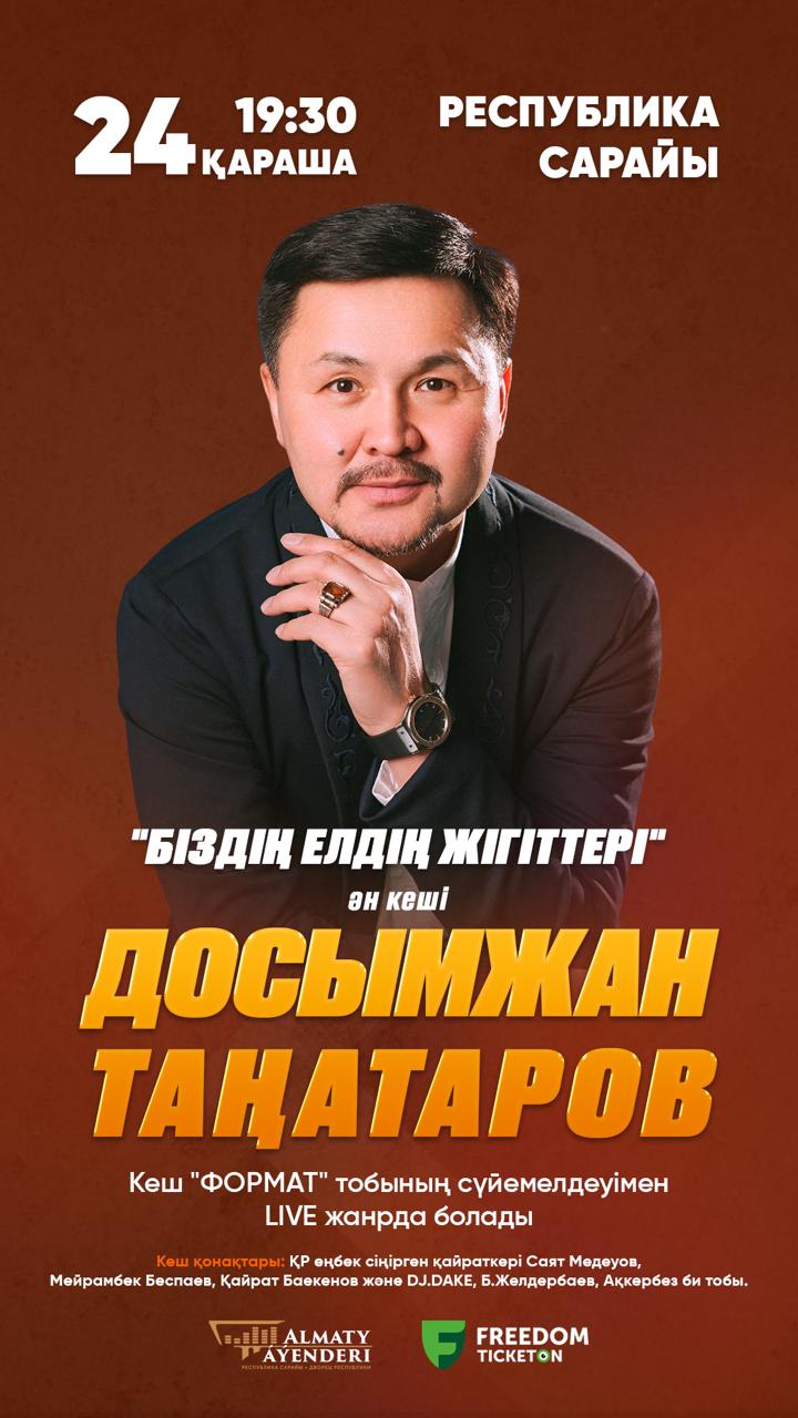 Қазақстан Республикасы "Еңбек сіңірген қайраткері","Дарын" Мемлекеттік жастар сыйлығының лауреаты,"Құрмет" орденінің иегері,белгілі әнші-термеші,ерекше үннің иесі Таңатаров Досымжан Қарпықұлы сахнада 30-жыл,елеулі 50-жас мерей тойын Алматы қаласы Республика сарайында 24-ші қараша 19.30-да "Формат" тобының сүйемелдеуімен "Біздің елдің жігіттері" ән кешін LIVE форматта, өнердегі достары Саят Медеуов,Мейрамбек Беспаев,Қайрат Баекенов,DJ Dake,т.б өнерпаздармен сахнада атап өтпек. Естен кетпес кештің куәсі болыңыздар.